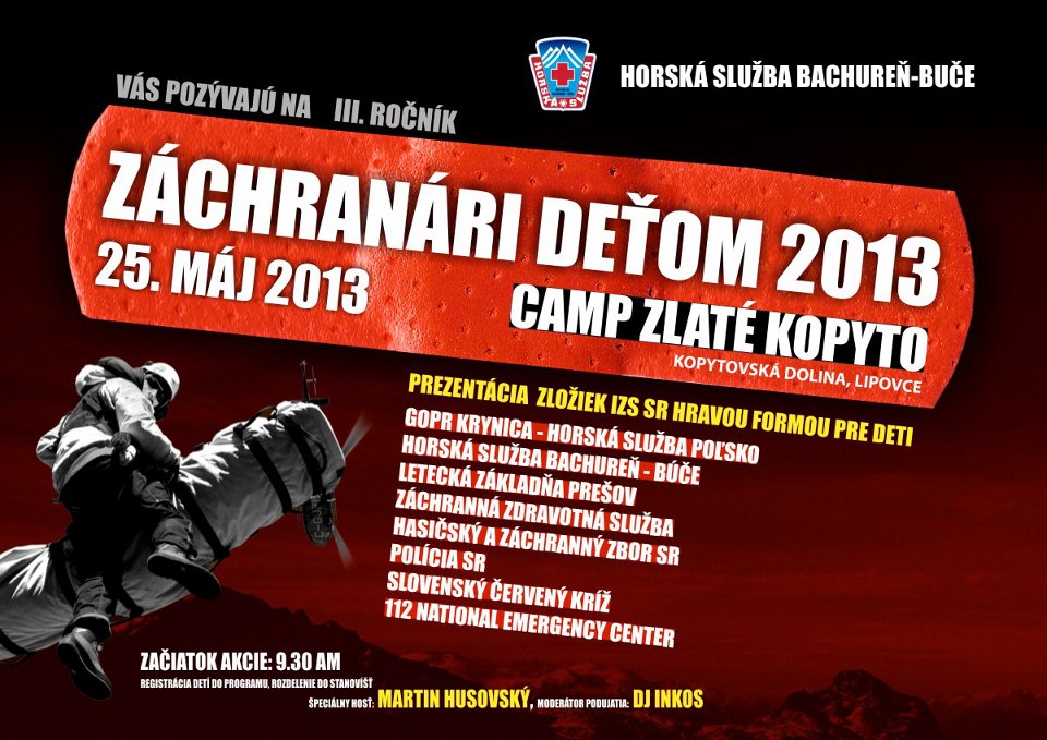 Horská služba Bachureň – Buče vás pozývajú na III. ročník Záchranári deťom 2013, ktorý sa bude konať 25. mája 2013 v Camp Zlaté Kopyto v Kopytovskej doline. Viac info nájdete na letáku